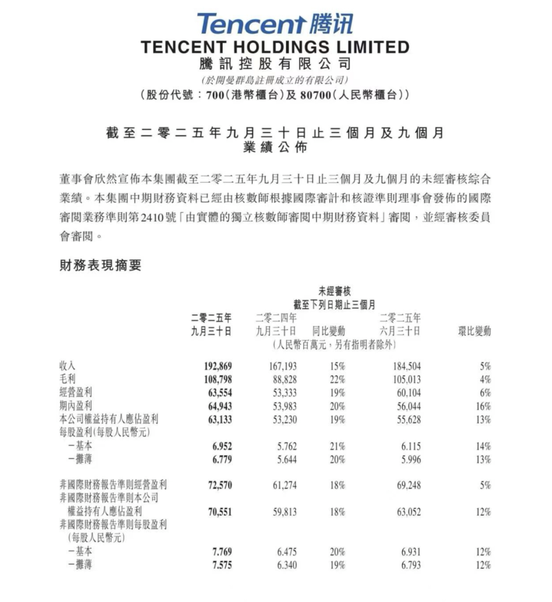 发表时间:2025-11-26 09:29 11月13日,腾讯发布今年第三季度财报,实现营收1928.69亿元人民币,较2024年同期的1671.93亿元同比增长15%;经营盈利635.54亿元,同比增长19%;经调整净利润705.51亿元,同比增长18%。 ![]() 11月13日,腾讯发布今年第三季度财报,实现营收1928.69亿元人民币 截至目前,腾讯在2025年前三季度累计收入总金额为5573.95亿元,较2024年同期(4878.11亿元)同比增长14%。 营收、利润双双实现两位数增长,在头部互联网公司中已是稀缺的增长韧性。并且,腾讯的自由现金流已经达到585亿元,现金净额环比激增37%至1024亿元,财务盘面相当稳健。 这一次,推动增长的关键因素是AI。 在本季财报中,AI一词被提到了11次,成为贯穿财报的关键词。腾讯公司总裁刘炽平在财报后的电话会上指出,AI在腾讯本季度的营收和毛利水平上都做出了不小的贡献。 这传递出一个信号:AI并非空泛的概念,它真实地增加了互联网公司的营收。并且目前来看,效果显著。 ![]() ![]() 在此次腾讯财报内容中可见的是:AI确实具备推动互联网公司营收的能力/顾芗·AI制图 而放眼行业,围绕AI的竞争仍在持续升温。2025年11月17日,阿里巴巴正式推出“千问APP”公测版,全力进军AI to C市场,最近,字节跳动的豆包也开始“聊天带货”。 在AI的驱动下,互联网大厂正逐步告别过去那种收缩、保守和略显悲观的氛围,转向一个更广阔的新阶段,它更加积极、技术含量更高,但同样有残酷的一面。 AI出尽风头 腾讯的这份业绩并非偶然。回溯2005年10月,刘炽平协助马化腾完成第二次组织架构调整,以事业部制度打破了社交业务的单一依赖,为后续游戏、金融科技、广告等业务的并行生长埋下伏笔。 更关键的是,这次调整塑造了腾讯“战略投资+业务协同”的双重基因——在文化娱乐、游戏、大消费等领域的龙头布局,规避了单一赛道的周期风险,还为生态协同提供了丰富的场景土壤。 如今在国内几家科技巨头当中,论综合规模和盈利,腾讯都是表现最为全面的公司。二十年过去,真正支撑起腾讯这份“稳健”的,仍是那几台老引擎。 腾讯首先是一家游戏平台公司,游戏业务依然是头号现金牛。最新财报显示,腾讯游戏业务继续保持着高增长,总收入为636亿元。其中,本土市场游戏收入428亿元,同比增长15%;国际游戏收入首次突破200亿元,达208亿元,同比暴增43.4%,超预期14.8%,成为最大亮点。 其次,腾讯是一家金融科技公司,商业支付、理财和云服务收入占比超3成。今年第三季度,腾讯金融科技与企业服务收入582亿元,同比增长10%。 第三是广告业务,腾讯的广告业务带动收入362亿元,同比增长21%,毛利率提升至57%,该业务已经连续十二个季度保持两位数增速。 可以看到,腾讯三大核心业务板块收入均实现两位数同比增长,没有一项拖了后腿。 三大业务之后,才是人们更为熟悉的腾讯社交网络业务。第三季度,腾讯在视频号、腾讯音乐、腾讯视频等社交网络业务方面收入323亿元,同比增长5%。用户生态方面,微信月活用户达14.14亿,基本盘稳固,但增速放缓,QQ月活用户量继续下滑。 这波业绩里, AI把风头抢得明明白白。腾讯在财报中强调了AI对每一个核心业务板块的贡献。 AI具体是如何推动收入增长的?腾讯在财报开头中写道:“我们对AI的战略投入,不仅为我们在广告精准定向及游戏用户参与度等业务领域带来助益,也带来了编程、游戏以视频制作领域的效率提升。” 最直观的是广告业务。刘炽平在电话会上提到,本季度广告收入增长中约有一半来自于AI驱动的广告技术带来的ECPM(有效千次展示成本)提升。也就是说,AI通过数据分析,可以将广告精准地展示给目标人群,使得广告的点击率和转化率大幅提升,推高了广告位的价格。 AI提升广告点击率的效果已经得到了验证。腾讯首席战略官 James Mitchell 此前曾表示,历史上横幅广告点击率约 0.1%,信息流广告约 1%,而 AI 已使部分广告点击率飙升至 3.0%,增长潜力仍待挖掘。 在金融科技与企业服务方面,腾讯在财报中写道,企业服务收入同比增长十几个百分点,受益于云服务的收入增长,其中包括企业对AI相关服务需求上升带动的增长。 云服务是通过互联网提供算力的服务,是数字世界中的基础资源,因此成为科技巨头重点布局的对象。刘炽平在电话会上表示:“若没有 AI 芯片供应限制,我们的云收入本应增长得更快。” 在游戏方面,刘炽平提到,游戏用户参与度和内部流程提效也同样受益于AI的投入。 AI对游戏的助力主要体现在提升用户体验上。今年3月,《和平精英》引入了DeepSeek大模型,推出AI助手和AI队友为玩家提供游戏指导和对局陪伴,根据QuestMobile的统计,当月,《和平精英》的用户时长同比增长了16%。 事实上,从2024年第四季度开始,腾讯就频繁在财报中提到AI,而此前的三个季度,AI在财报中出现的次数寥寥无几。目前来看,腾讯的AI战略蓝图正在兑现,并为腾讯赚到了真金白银。 新的角逐 AI的出现,为互联网大厂们提供了一个清晰的、令人兴奋的新增长故事,但众所周知,这个新故事格外昂贵。 市场敏锐地察觉到,当其他科技大厂都在AI基建上疯狂砸钱、搞“军备竞赛”的时候,腾讯选择了反其道而行之——直接调低了资本开支。 财报显示,腾讯在这一季度的资本开支环比下降超过32%,只有129.8亿元。腾讯还下调2025年全年资本开支指引,不过其表示,资本开支的下调受全球AI芯片供应链阶段性紧张的影响,